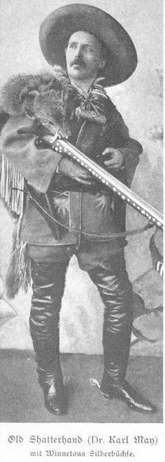 Der berühmte Westmann wird auf typische Weise in den Roman eingeführt: Man hält ihn zunächst für einen Neuling im Westen. Sein Aussehen legt das nahe: »Er war von nicht sehr hoher und nicht sehr breiter Gestalt. Ein dunkelblonder Vollbart umrahmte sein sonnenverbranntes Gesicht. Er trug ausgefranste Leggins und ein ebenso an den Nähten ausgefranstes Jagdhemd, lange Stiefel, welche er bis über die Knie emporgezogen hatte, und einen breitkrämpigen Filzhut, in dessen Schnur rundum die Ohrenspitzen des grauen Bären steckten. In dem breiten, aus einzelnen Riemen geflochtenen Gürtel steckten zwei Revolver und ein Bowiemesser; er schien rundum mit Patronen gefüllt zu sein ... Von der linken Schulter nach der rechten Hüfte trug er einen aus mehrfachen Riemen geflochtenen Lasso und um den Hals an einer starken Seidenschnur eine mit Kolibribälgen verzierte Friedenspfeife, in deren Kopf indianische Charaktere eingegraben waren. In der rechten hielt er ein kurzläufiges Gewehr, dessen Schloß von ganz eigenartiger Konstruktion zu sein schien, und in der Linken eine - - - brennende Cigarre, an welcher er soeben einen kräftigen Zug that, um den Rauch mit sichtlichem Behagen von sich zu blasen ... an diesem jungen ... Manne (sah) alles so sauber aus, als sei er erst gestern von St. Louis aus nach dem Westen aufgebrochen. Sein Gewehr schien vor einer Stunde aus der Hand des Büchsenmachers hervorgegangen zu sein. Seine Stiefel waren makellos eingefettet und die Sporen ohne eine Spur von Rost. Seinem Anzuge war kaum eine Strapaze anzusehen, und wahrhaftig, er hatte sogar seine Hände rein gewaschen.« (56f)